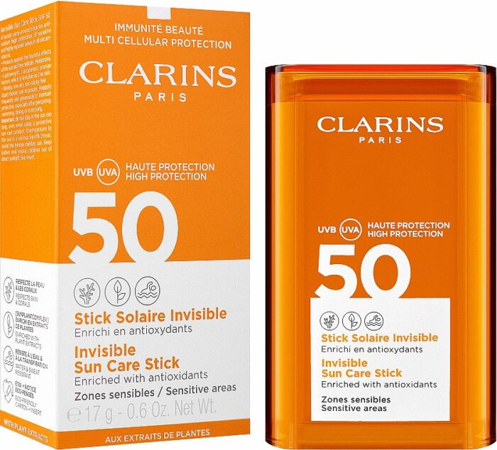ضد آفتاب استیکی کلارنس Clarins ضد حساسیت سولار اینویزیبل با محافظت بسیار بالا ویژگی های زیادی دارد. اندازه جیبی دارد که می توانید آن را در هر مکانی با خود ببرید. این ضد آفتاب استیکی بافت سبکی دارد و بدون باقی گذاشتن رد سفیدی و حالت چسبناکی جذب پوست شما می شود. این محصول قادر است تا از حساس ترین نقاط پوست صورت شما در برابر پرتوهای آسیب زای خورشید مانند ناحیه اطراف چشم، گونه ها، گوش ها و بینی و پیشانی به خوبی محافظت کند.
